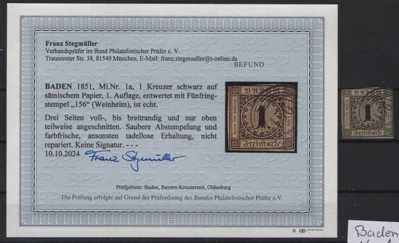 Baden, 1851, Mi.- Nr.:  1a, gestempelt, mit akt. Befund Stegmüller BPP; echt + ...! Schönes Kabinettstück! Selten!
