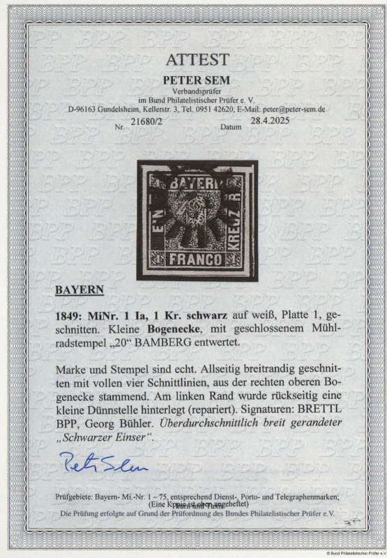 Bayern, 1849, Mi.- Nr.: 1 Ia, gestempelt, " kl. Bogenecke", akt. Fotoattest Sem BPP: "e + ...."! Gutes Kabinettstück! RR!
