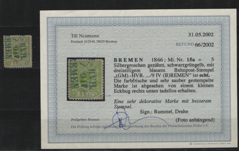 Bremen, 1867, Mi.- Nr.: 15 a, gestempelt, mit besserem Stempel! Befund T. Neumann BPP: e+ ...e! Prachtstück!