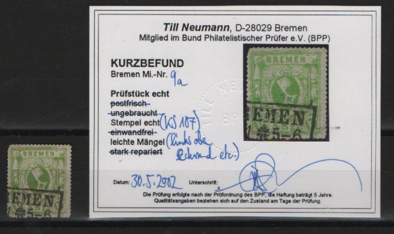 Bremen, ca. 1863, Mi.- Nr.: 9a, gestempelt, Kurzbefund T. Neumann BPP! Kabinettstück! Selten!