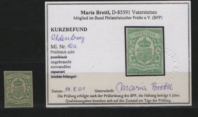 Oldenburg, 1861, Mi.- Nr.: 10 a, *, mit Kurzbefund Brettl BPP! Luxusstück! Selten!