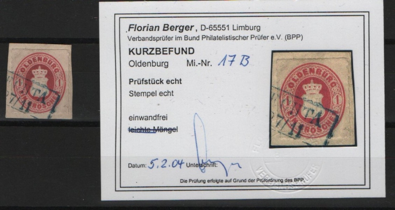 Oldenburg, 1867, Mi.- Nr.: 17 B, gest., auf kl Briefstück, mit Kurzbefund Berger BPP: "e+e"! Qualitätsstück! Selten!