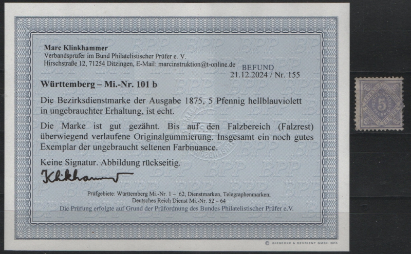 Württemberg, 1875, Bezirksdienstmarke Mi.- Nr.: 101 b, *, akt. FB- Klinkhammer BPP: e + ...! Gutes Kabinettstück, sehr selten!