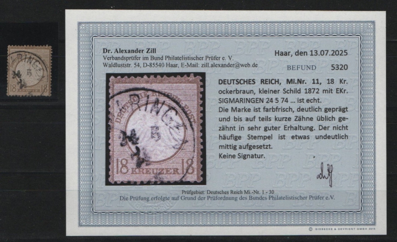 Dt. Kaiserreich, Brustschilder, 1872, Mi.- Nr.: 11, gestempelt! Akt. Befund Dr. Zill BPP: e+...! Gutes Bedarfsstück! Selten!