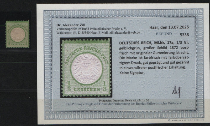 Dt. Kaiserreich, Brustschilder, 1872, Mi.- Nr.: 17 a, **! Akt. Befund Dr. Zill BPP: e+e! Luxusstück! Selten!