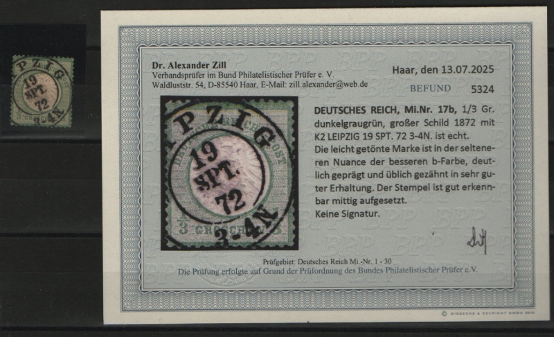 Dt. Kaiserreich, Brustschilder, 1872, Mi.- Nr.: 17 b! Gestempelt! Akt. Befund Dr. Zill BPP: e+ sehr gut! Qualitätsstück! Selten!