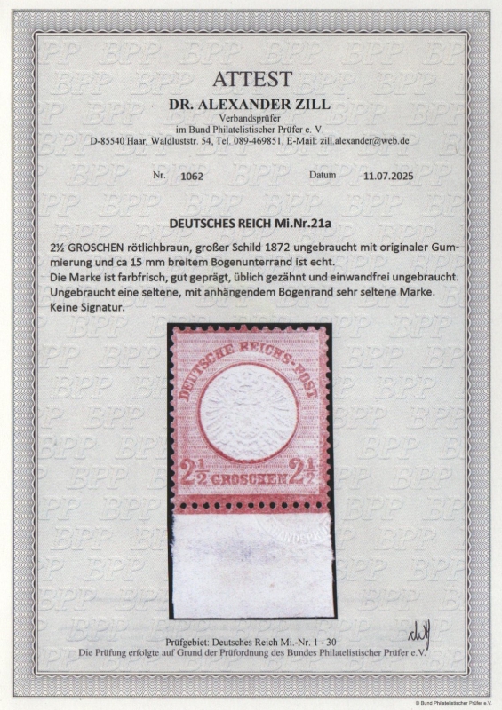 Dt. Kaiserreich, Brustschilder, 1872, Mi.- Nr.: 21 a, * mit Ur.! Akt. Fotoattest Dr. Zill BPP: e+e! Luxusstück! Sehr selten!