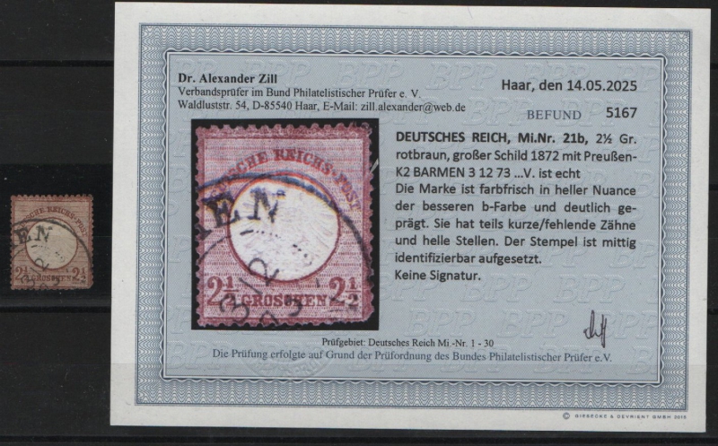 Dt. Kaiserreich, Brustschilder, 1872, Mi.- Nr.: 21 b, gestempelt! Akt. Befund Dr. Zill BPP: e+...! Kl. mgl., s. Befund! Selten!