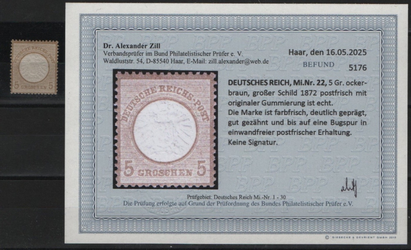 Dt. Kaiserreich, Brustschilder, 1872, Mi.- Nr.: 22, **! Akt. Befund Dr. Zill BPP: e+ ...! Kabinettstück! Selten!
