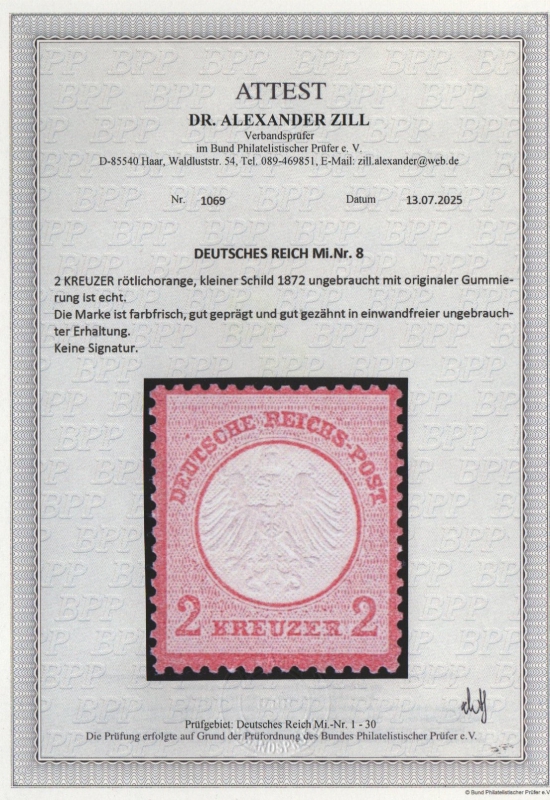Dt. Kaiserreich, Brustschilder, 1872, Mi.- Nrn.: 8, *! Akt. Fotoattest Dr. Zill BPP: "e+e"! Qualitätsstück! Selten!
