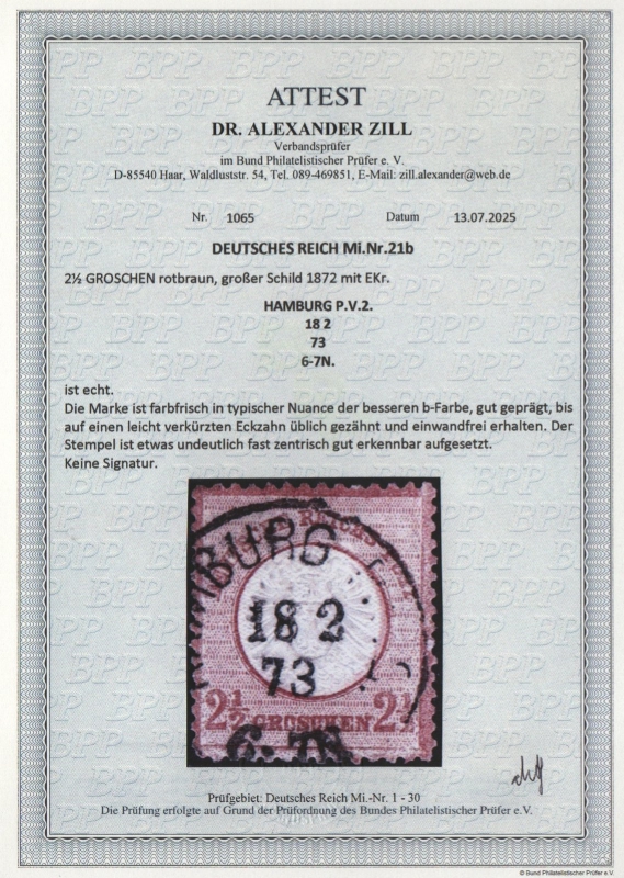 Dt. Kaiserreich, Brustschilder, 1873, Mi.- Nr.: 21 b, gestempelt! Akt. Fotoattest Dr. Zill BPP: e+...e! Kabinettstück! Selten!