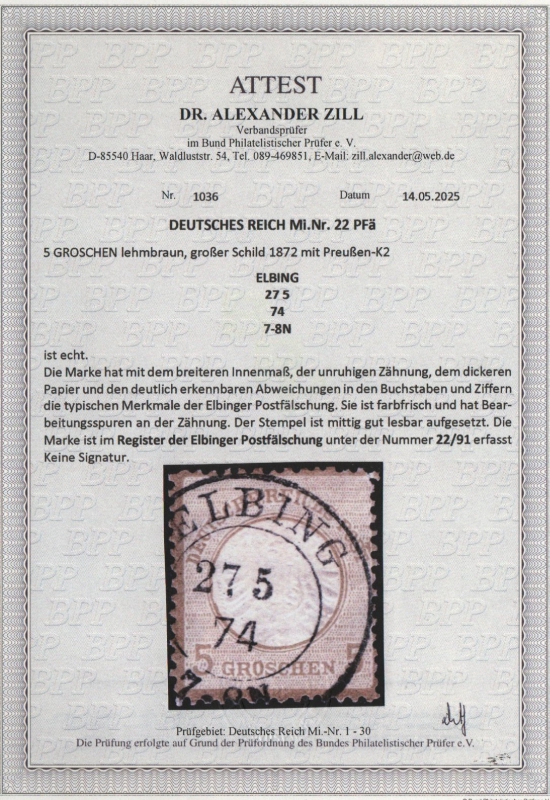 Dt. Kaiserreich, Brustschilder, 1874, Mi.- Nr.: 22 PFä, gestempelt! Akt. FA Dr. Zill BPP: e + ...! Seltenes und gutes Kabinettstück!