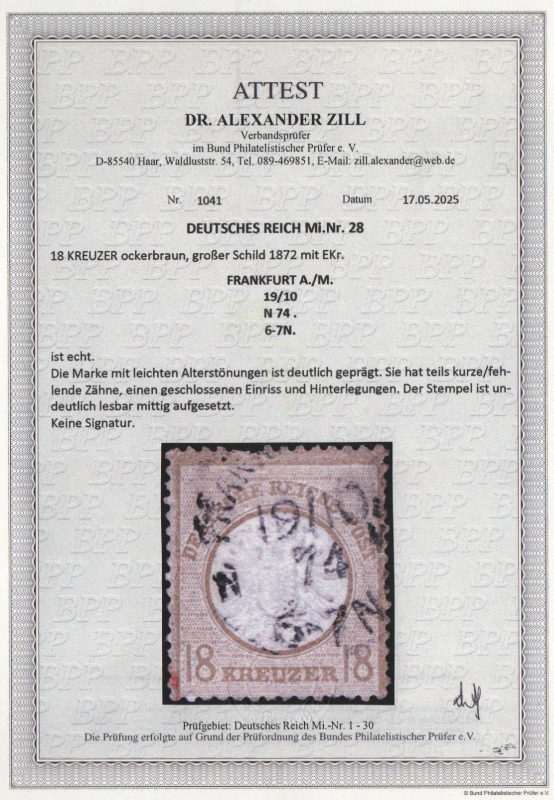 Dt. Kaiserreich, Brustschilder, 1874, Mi.- Nr.: 28, gestempelt! Akt. FA Dr. Zill BPP: e+ ...! Seltenes Kabinettstück!
