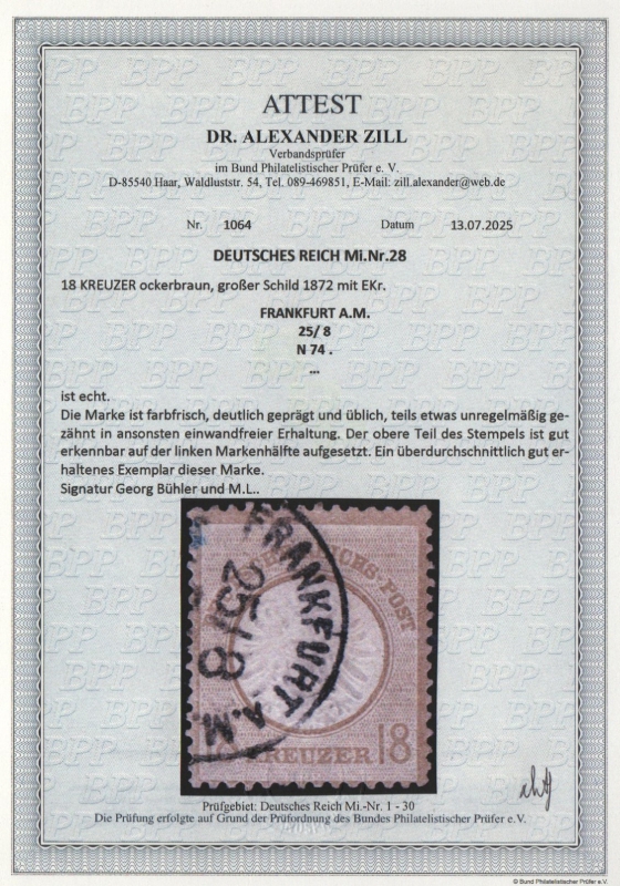 Dt. Kaiserreich, Brustschilder, 1874, Mi.- Nr.: 28, gestempelt! Akt. Fotoattest Dr. Zill BPP: "e+...e"! Kabinettstück! Selten!