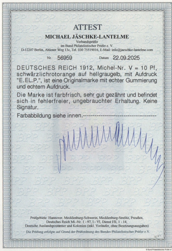 Dt. Kaiserreich, Flugpost, 1912, Mi.- Nr.: V, *! Akt. FA. Jäschke- L. BPP; "e+e"! Luxusstück! Selten!