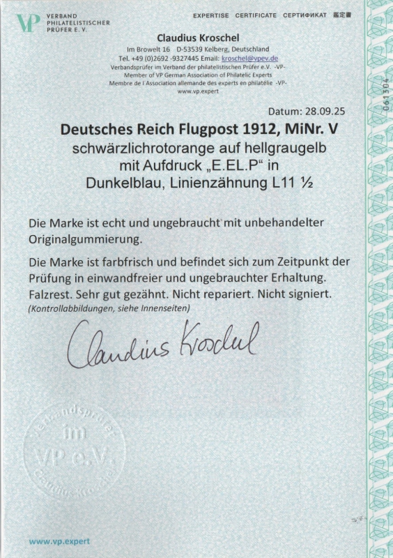 Dt. Kaiserreich, Flugpost, 1912, Mi.- Nr.: V, *! Akt. FA. Kroschel VP / VPEX; "e+e"! Luxusstück! Selten!