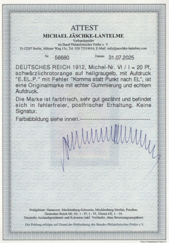 Dt. Kaiserreich, Flugpost, 1912, Mi.- Nr.: VI, mit PF.: I, **! Akt. FA. Jäschke- L. BPP; "e+e"! Luxusstück! Sehr selten!