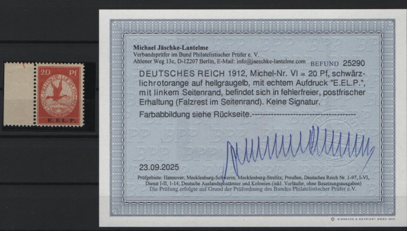 Dt. Kaiserreich, Flugpost, 1912, Mi.- Nr.: VI, **, mit Sr. (hier *)! Akt. Befund Jäschke- L. BPP; "e+e"! Luxusstück! Selten!