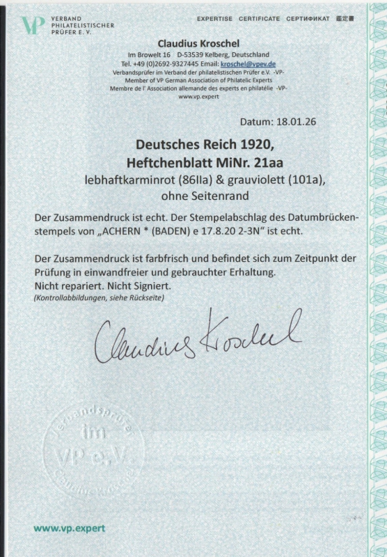 DR, Germania, 1920, HBL, Mi.- Nr.: 21 aa, gestempelt, akt. FA Kroschel VPeV/ VPEX, e + e! Gutes Bedarfsstück! Selten!