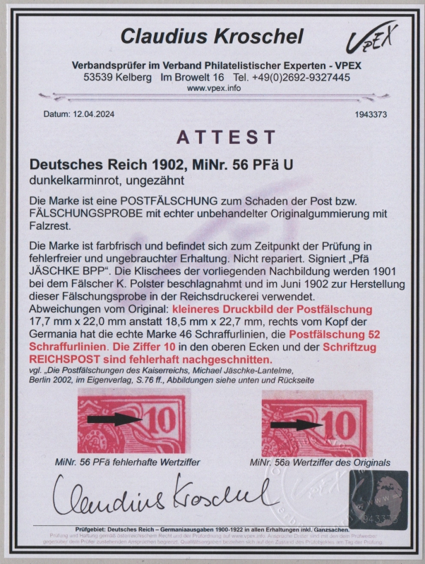 DR, Germania- Reichspost, Mi.- Nr.: 56 PFä U, *, akt. Attest Kroschel, VPEX; "fehlerfrei"! Sehr selten!