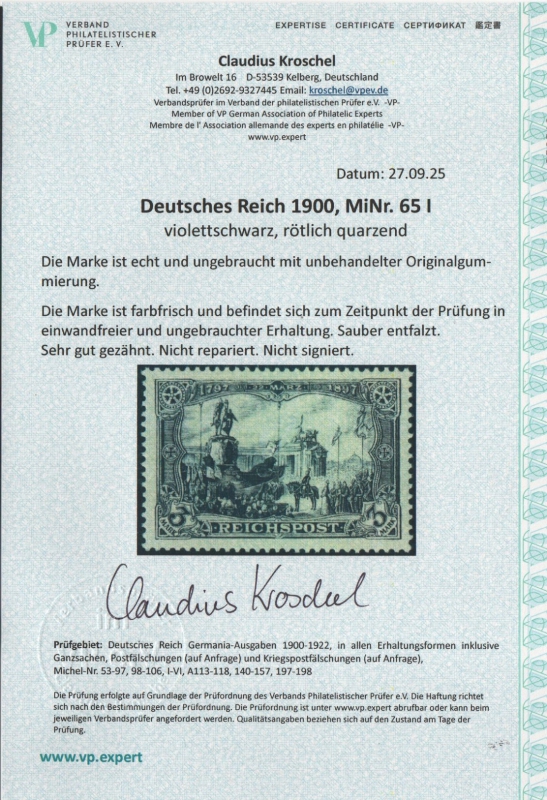 DR, Germania- Reichspost, Mi.- Nr.: 65, Type I, *, akt. FA Kroschel VP / VPEX; e+e! Luxusstück! Selten!