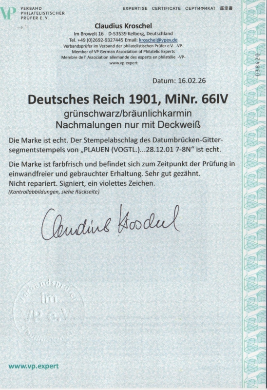 DR, Germania- Reichspost, Mi.- Nr.: 66, Type IV, gestempelt, akt. FA Kroschel VP / VPEX; e+e! Qualitätsstück! Selten!