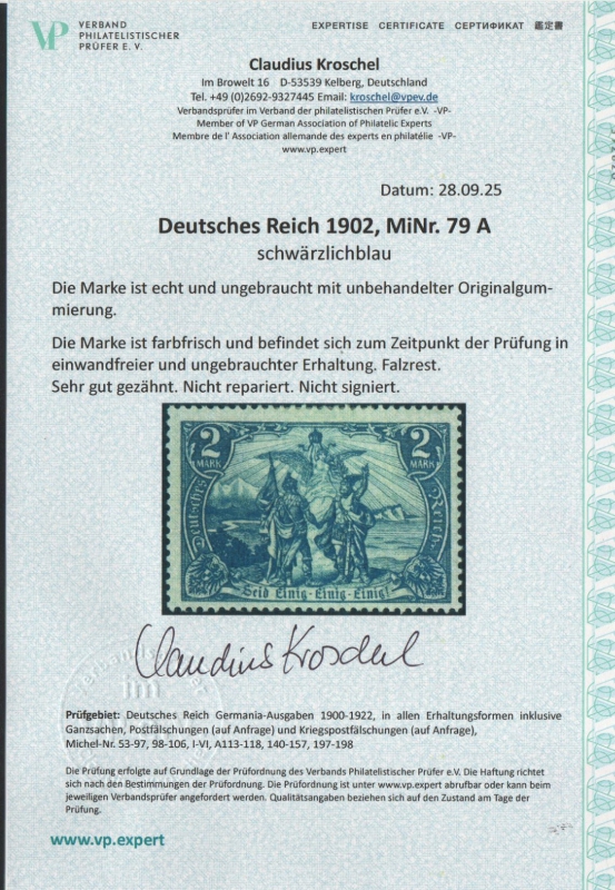 Dt. Kaiserreich, 1902, Germania o. Wz., Mi.- Nr.: 79 A, *, akt. FA Kroschel VP / VPEX; e+e! Luxusstück! Selten!