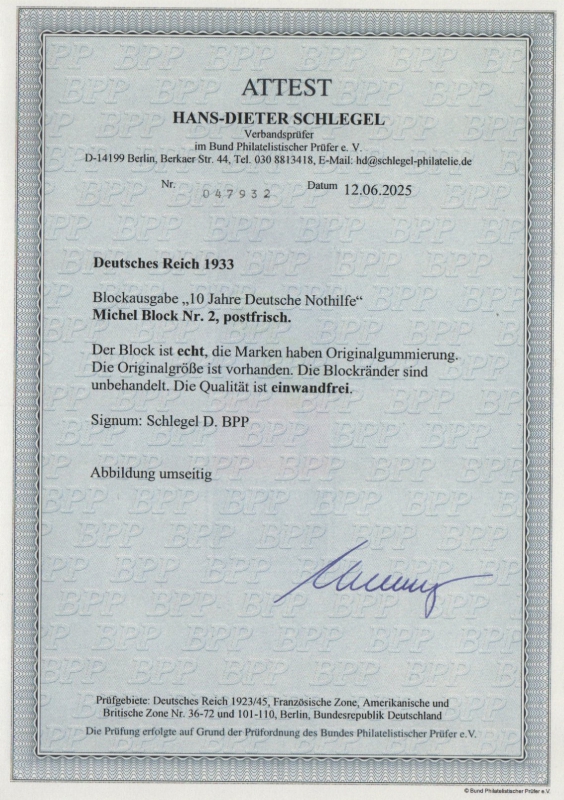 III. Reich, 1933, Mi.- Nr.: Bl. 2, **, Der Nothilfeblock, akt. (6/25) FA Schlegel BPP; e + e! Luxusstück! RR!