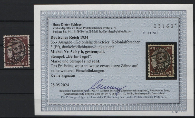 III. Reich, 1934, Mi.- Nr.: 540 y b, gestempelt, akt. Befund Schlegel BPP; "echt und ...."! Bedarfsstück!