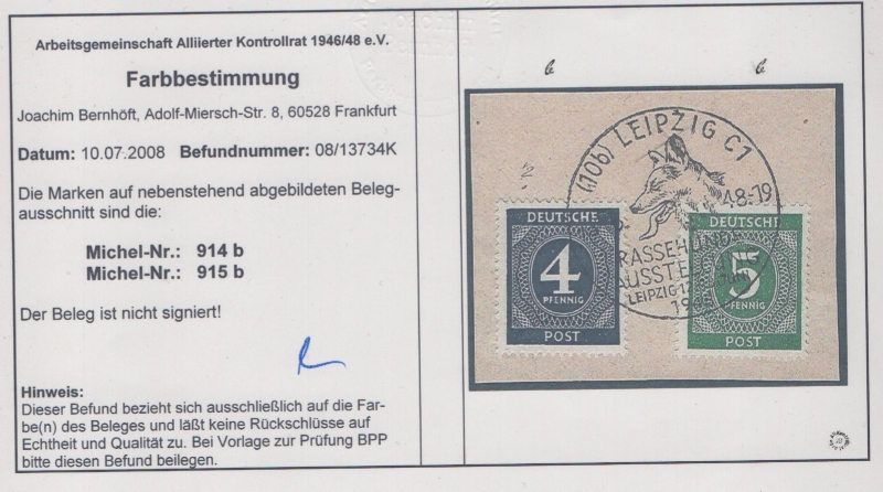 Allierte Besetzung / Kontrollrat, 1946, Mi.- Nr.: 914 b, u.a. auf Briefstück, Farbbefund Bernhöft ARGE! Luxusstück!