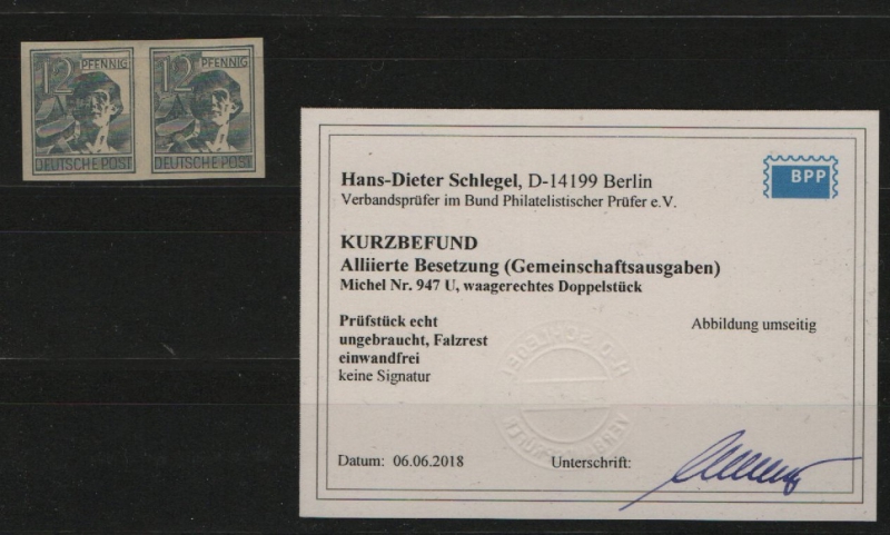 Kontrollrat, 1947, Mi.- Nr.: 947 U (2x), *, mit K.- Befund Schlegel BPP; echt und einwandfrei! Sehr selten!