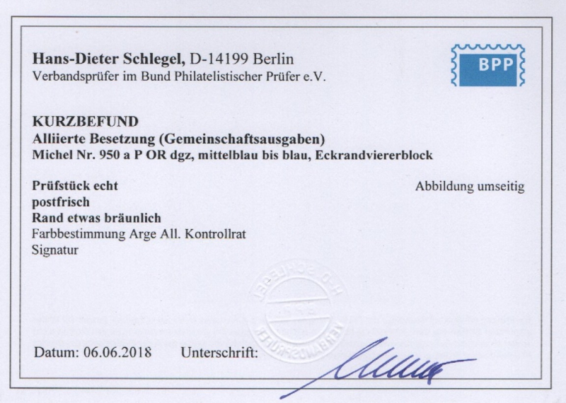 Kontrollrat, 1947, Mi.- Nr.: 950 a, ER- 4er- Block, POR dgz, **, Farbgeprüft Bernhöft / K.- Befund Schlegel BPP! Kabinettstück, sehr selten!