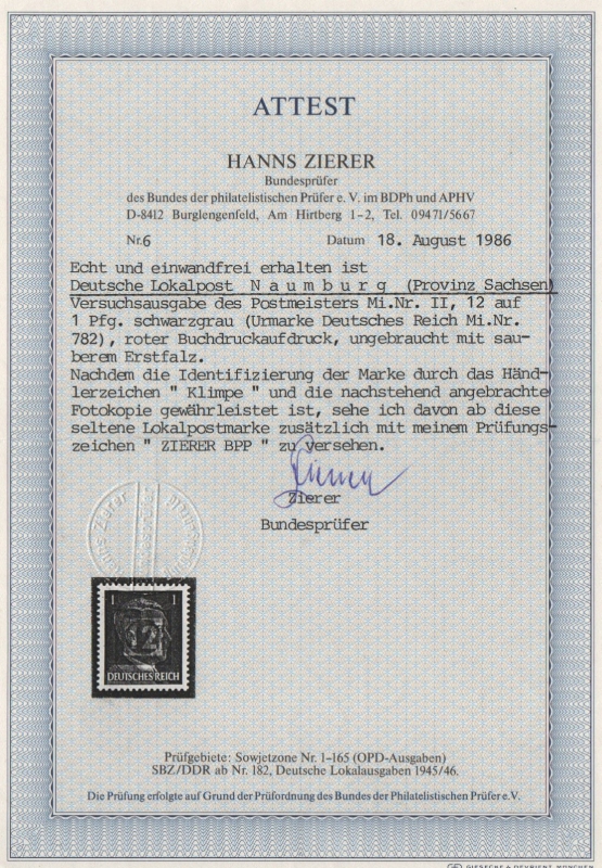 Deutschland- OST, Lokalausgaben, Naumburg, 1945, Mi.- Nr.: II , *, FA Zierer BPP: e+e! Luxusstück! Sehr selten!