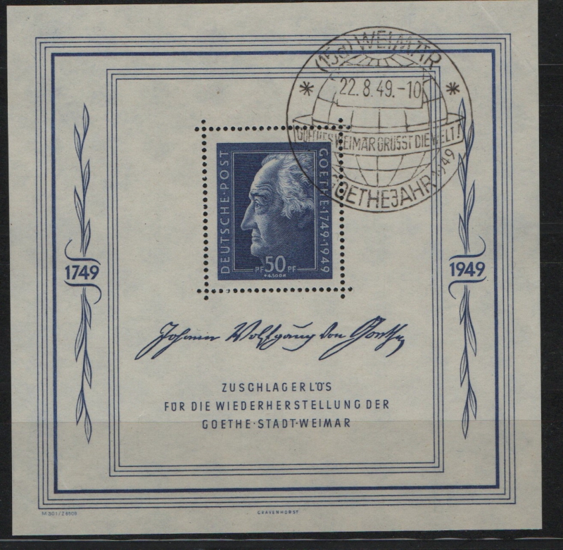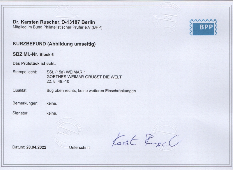 SBZ, Allgem. Ausgaben, 1949, Mi.- Nr.: Bl. 6, gestempelt mit Weltkugelstempel!, K.- Befund Dr. Ruscher BPP, "echt + ..."! Kabinettstück!