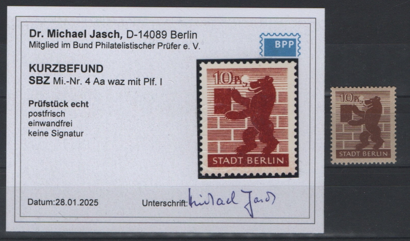SBZ, 1945, Berlin / Brandenburg, Mi.- Nr.: 4 Aa waz mit Plf. I, **, akt K.- Befund Dr. Jasch BPP: "e+e"! Luxusstück! Selten!