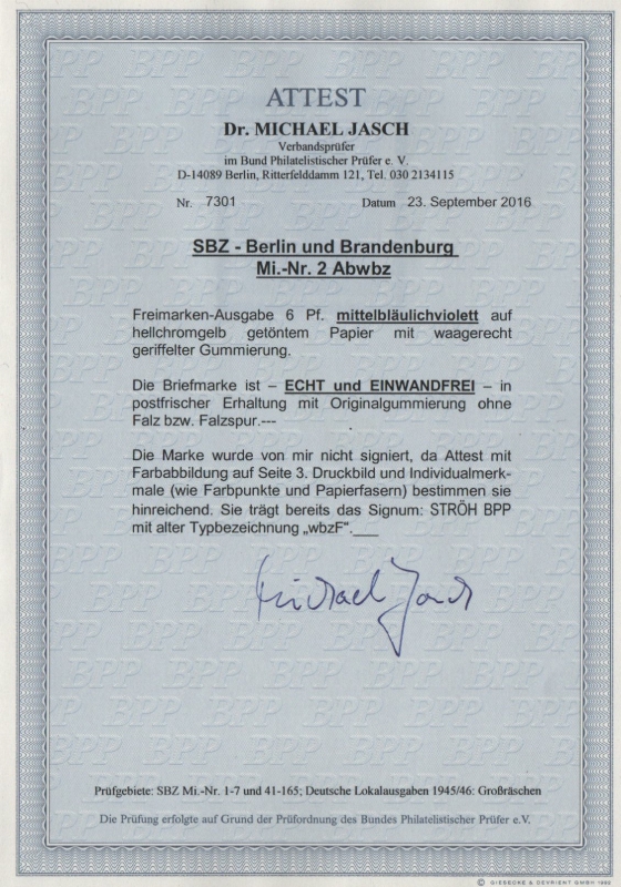 SBZ, Berlin- Brandenburg, 1945, Mi.- Nr.: 2 A b wbz, **, Fotoattest Dr. Jasch BPP: "echt und einwandfrei"! Rarität!