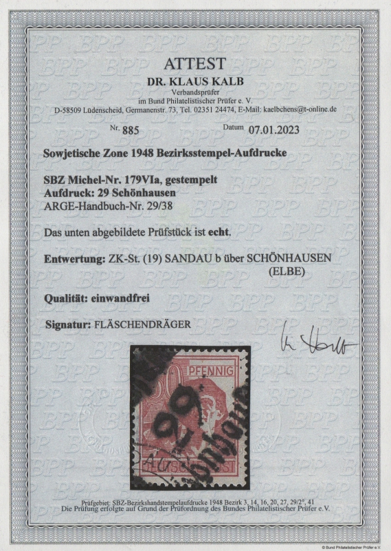 SBZ, Handstempel, 1948, Mi.- Nr.: 179VIa, Die Helle 60er, Bez. 29, Schönhausen, gestempelt, akt. FA Dr. Kalb BPP! e+e!