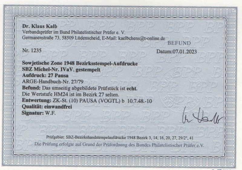 SBZ, Handstempel, 1948, Mi.- Nr.: IVa V, Bez. 27, Pausa, gestempelt, akt. FB Dr. Kalb BPP: e+e! Luxusstück! Selten!