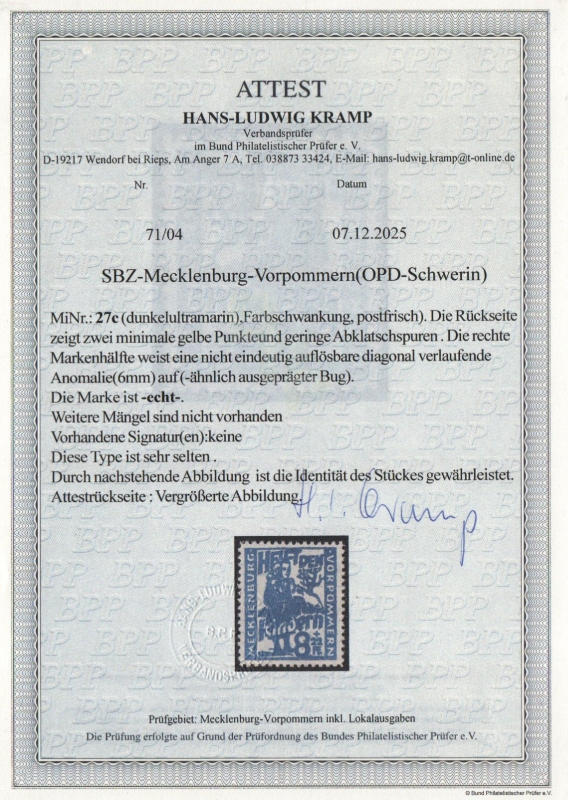 SBZ- MVP, 1945, Mi.- Nr.: 27 c (!) **, aktuelles Fotoattest Kramp BPP: "echt + ...", Prachtstück! Top- Rarität!