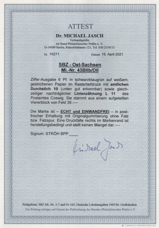 Ost- Sachsen, 1945, Mi.- Nr.: 43 BIIb / DII, **, akt. Fotoattest Dr. Jasch BPP: echt + einwandfrei! Luxusstück!