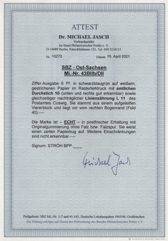 Ost- Sachsen, 1945, Mi.- Nr.: 43 BIIb / DII vom SR, **, akt. Fotoattest Dr. Jasch BPP: echt + ...! Kabinettstück!