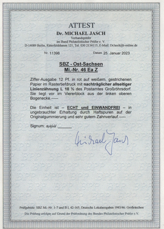 Ost- Sachsen, 1945, Mi.- Nr.: 46 Ea Z (4er- ER!), Postmeisterttr. Großröhrsdorf!, **/*, akt. Fotoattest Dr. Jasch BPP: "echt + ...."! Kabinettstück!