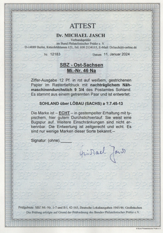 Ost- Sachsen, 1945, Mi.- Nr.: 46 Na, Postmeistertrennung Sohland!, gestempelt, akt. Fotoattest Dr. Jasch BPP: "echt + ...."! Kabinettstück!