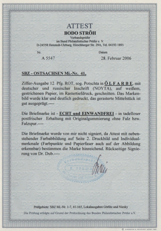 Ost- Sachsen, 1945, Mi.- Nr.: BI b (ex 41), sogenannte "Potschta", **, Fotoattest Ströh BPP: "echt + e"! Luxusstück!