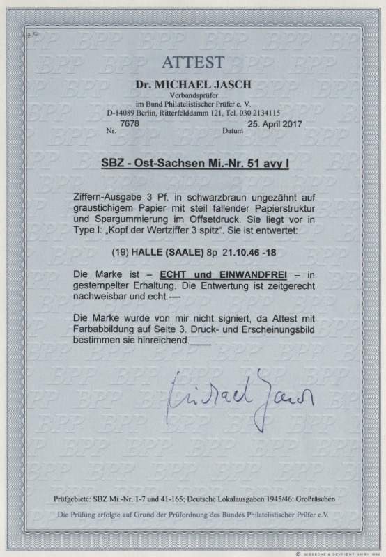 Ostsachsen, 1946, Mi.- Nr.:51 a vy I, gestempelt! Fotoattest Dr. Jasch BPP; "echt und einwandfrei"! Luxusstück! R!