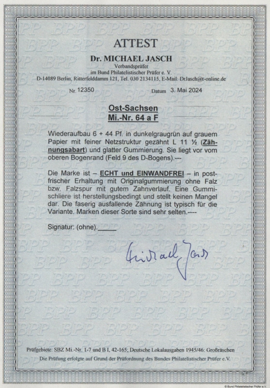 Ostsachsen, 1946, Mi.- Nr.: 64 a F, mit Or., **! Akt. Fotoattest Dr. Jasch BPP; echt und einwandfrei! Luxusstück! RR!