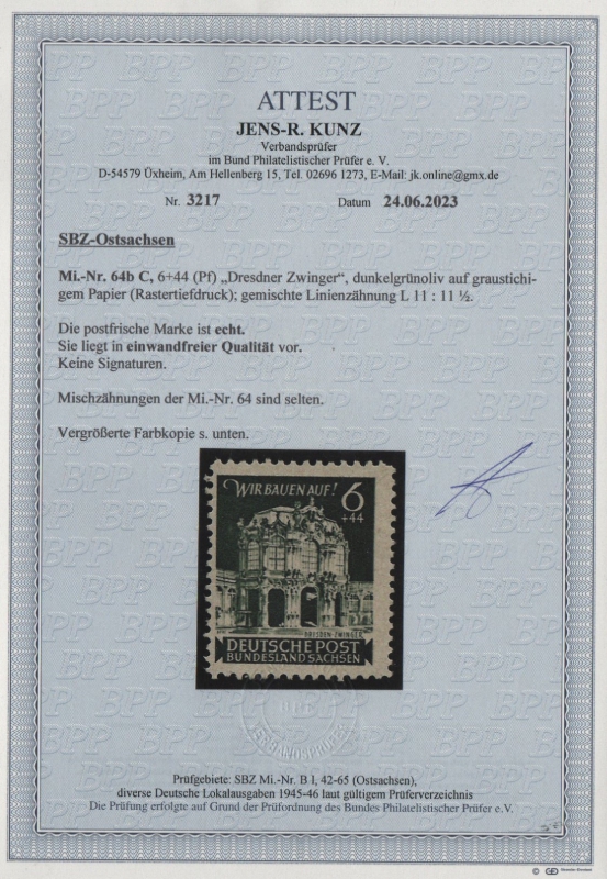 Ostsachsen, 1946, Mi.- Nr.: 64 b C, **! Akt. Fotoattest Kunz BPP; "echt und einwandfrei"! Luxusstück! RR!