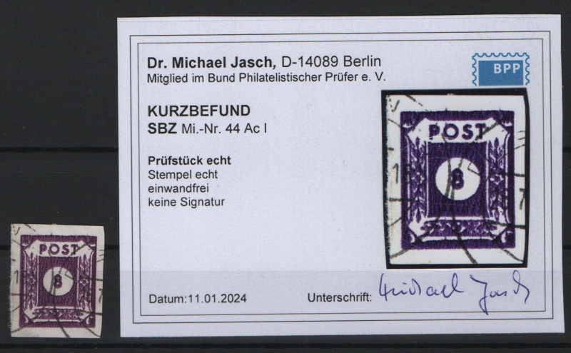 SBZ, Ost- Sachsen, 1945, Mi.- Nr.: 44 Ac I, gestempelt, aktueller K.- Befund Dr. Jasch BPP: "echt und einwandfrei" Selten!