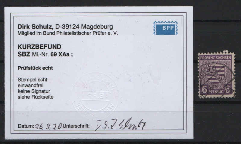 SBZ, Provinz Sachsen, 1945, Mi.- Nr.: 69 AXa, gestempelt, K.- Befund Kunz BPP: echt und einwandfrei! Qualitätsstück!