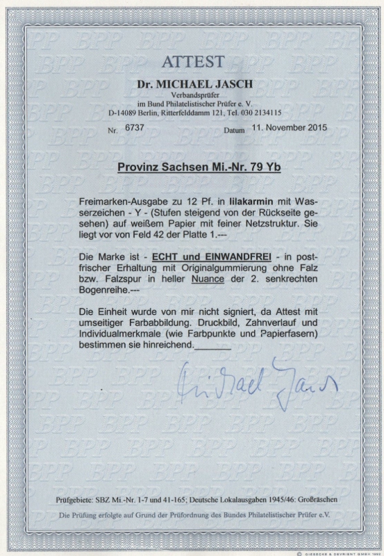 SBZ, Provinz Sachsen, 1945, Mi.- Nr.: 79 Y b, **, Fotoattest Dr. Jasch BPP: echt und einwandfrei! Luxusstück!